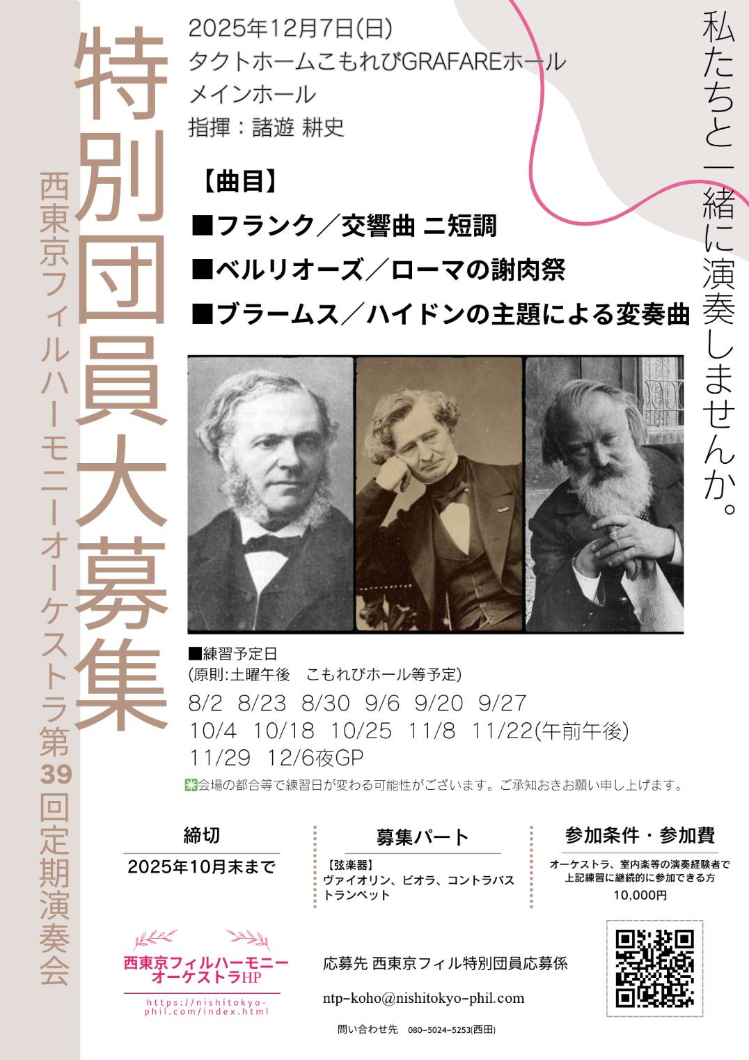 西東京フィルハーモニーオーケストラでは、特定の演奏会に参加する特別団員を募集しています。